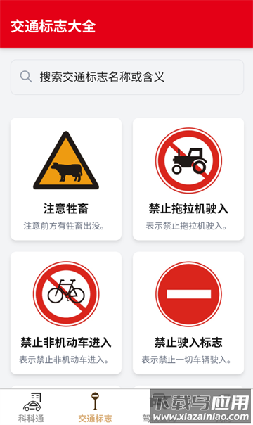2、标志百科按禁令、指示、警告等类型分类,点击任意标志可查看三维模型和考试出现频率;