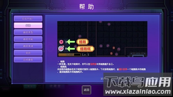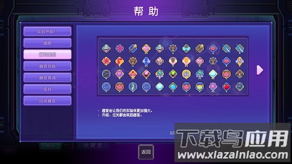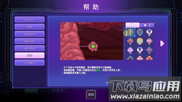 战斗中掉落的细胞是重要强化素材,未被即时收集的细胞会暂存于细胞瓶,下次拾取时获得双倍补偿。关卡结算时可在培养室消耗细胞永久提升攻击力、生命值等基础属性,或解锁新的器官槽位。高阶器官需要累积足够细胞才能激活使用权限。