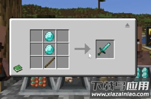 3、钻石剑:木棍+两个钻石 木棍需要由原木分解成木板,钻石就直接用原料,如图摆放即可。