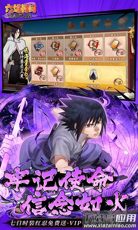 1、每日登录领取超值福利:VIP等级、红色品质忍者、限定时装等奖励轻松获取;