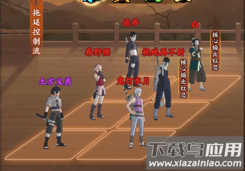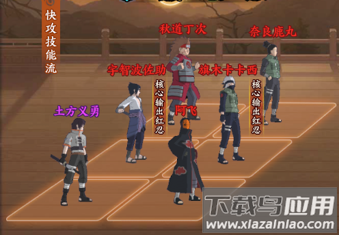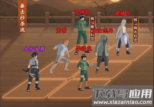 君麻吕的尸骨脉提供全队暴击增益;油女志乃的寄坏虫造成持续dot伤害;李洛克的八门遁甲爆发惊人;迈特凯的朝孔雀附加群体破甲;重吾的咒印状态补充aoe输出。
