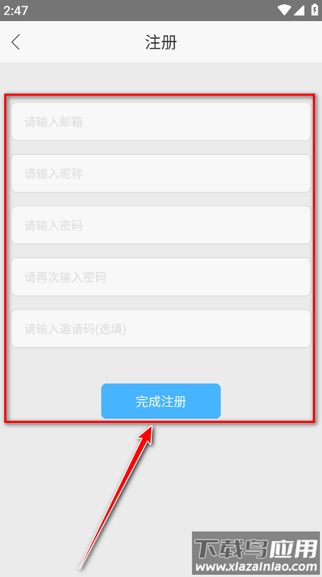 4.请输入邮箱、昵称、密码、再次输入密码,最后点击完成注册按钮即可。