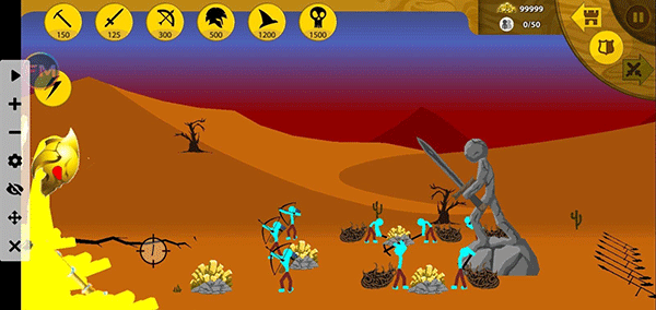 开局建议集中资源训练矿工,确保经济优势;中期根据敌方兵种选择克制单位,弓箭手集群对步兵效果显著;后期可组建混合部队发起总攻。注意随时调整战术,遭遇强敌时可暂时撤退重整队伍。战场右侧的三个指令按钮要灵活运用,防御模式能有效保护基地,进攻指令适合兵力占优时使用。