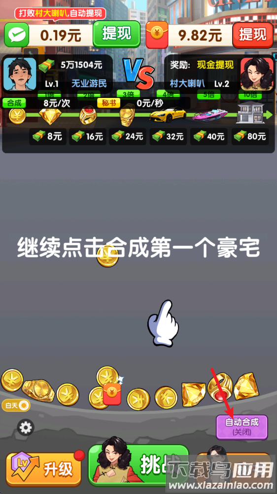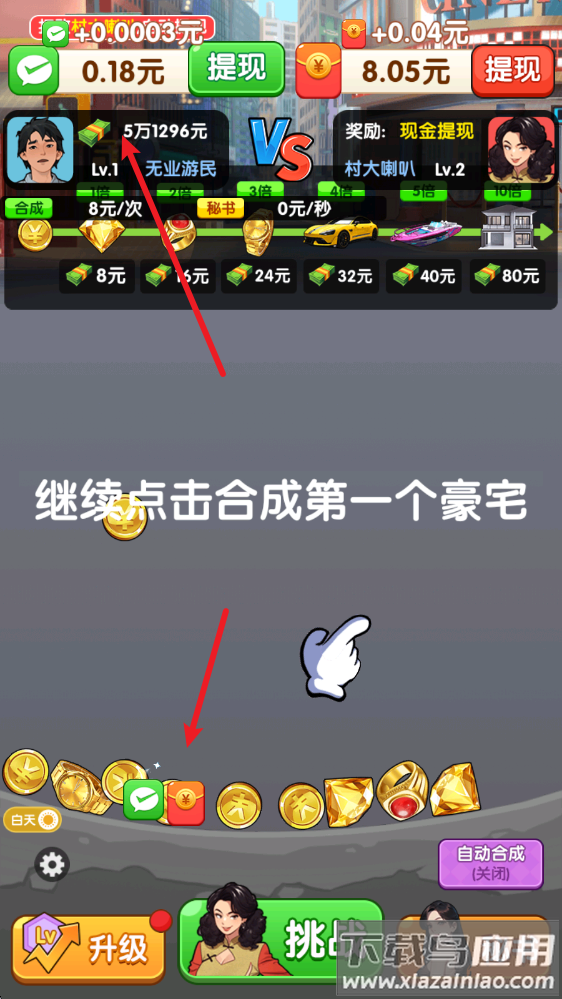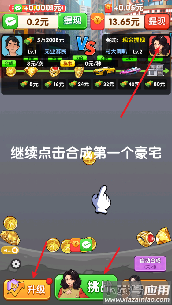 在这款以逆袭人生为核心的合成休闲游戏中,你将体验从底层青年到商业大亨的蜕变之旅。开局你只是个失业的普通人,意外获得神秘升级系统后,通过指尖操作开启财富积累之路。游戏将合成玩法与商业模拟巧妙结合,每次点击都能产生金币收益,持续合成可解锁更高级资产。随着等级提升,你将面对不同行业的竞争对手,击败他们能获得丰厚奖励;经济系统会实时模拟市场波动,需要灵活调整经营策略。喜欢挑战财富巅峰的玩家,现在就可以下载体验。