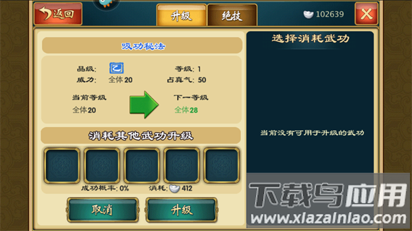 消耗多余武学可进行升级,每次最多放入5本武学材料;