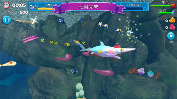 注意观察右上角的饥饿度指示条,长时间未进食会导致游速下降。海底漩涡可以帮你快速到达海面区域,但要注意避开正在盘旋的海鸥群。每日登陆能领取钻石奖励,这些钻石可以用来兑换限量版鲨鱼皮肤。