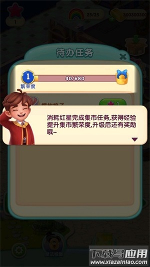 3、挑战成功后,点击"任务",在这里你将会看到待办任务,完成任务即可获得经验;收集红星后可通过消耗红星完成集市任务,提升繁荣度还能解锁特殊奖励;