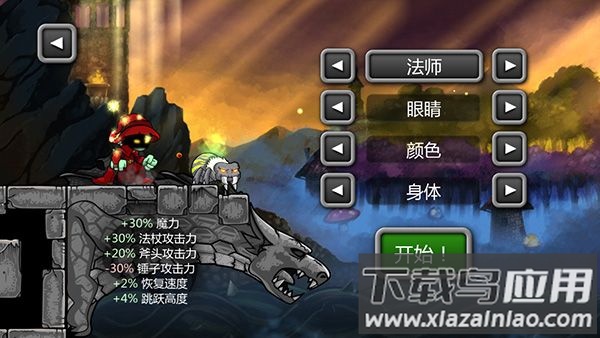 3、法师:魔力+30%,法杖攻击力+30%,斧头攻击力+20%,锤子攻击力-30%,恢复速度+2%,跳跃高度+4%;