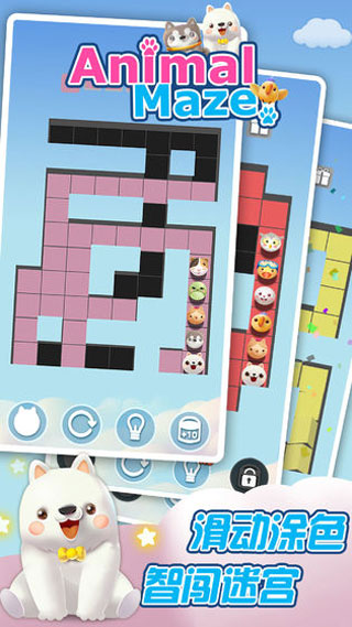 手指滑动控制宠物移动,走过的格子会自动上色。当彩色面积超过80%就能通关,但要小心死胡同,有些关卡需要同时指挥三只宠物协作;