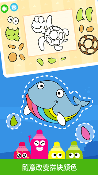 启动游戏后点击屏幕中央的萌宠图标进入关卡选择;每个关卡都配有预览图,小朋友可以根据兴趣自由选择;拼图碎片采用大尺寸设计,方便小手拖动拼接;涂色环节提供24色颜料盘,让孩子尽情发挥想象力。