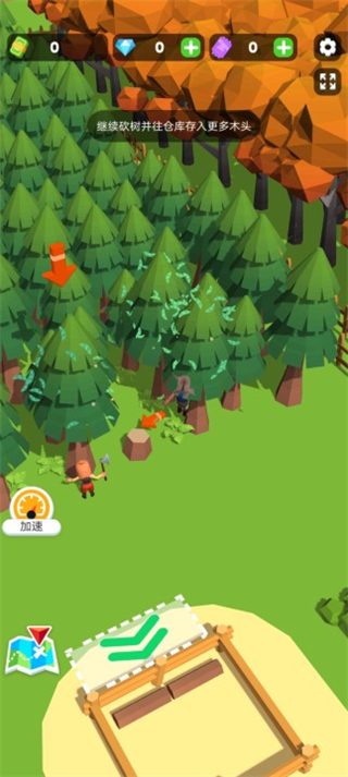 滑动屏幕移动角色,消耗5金币解锁第一个原料仓库;控制角色进入林区会自动开始伐木作业。