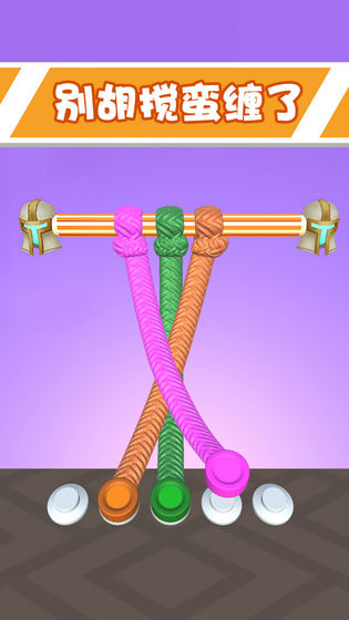 游戏核心是解开三维空间中的复杂绳结,玩家需通过拖拽、旋转等操作分离交织的绳索;每关设有隐藏解谜路径,正确操作顺序往往需要多次尝试才能发现;部分高级关卡会加入移动障碍物,实时变化的场景增加解绳难度。