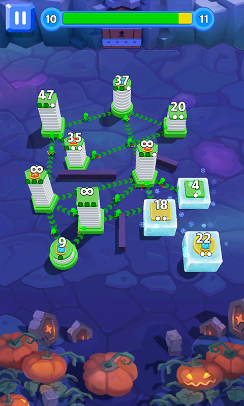 游戏开始时绿色建筑代表你的阵营,白色圆点显示可出兵次数;通过拖拽连线向目标发起进攻,注意保留备用路线;当连接线满载时,可以切断旧路线开辟新战场;占领进度条满格即可通关,后续关卡会出现更多出兵路线需要统筹安排。