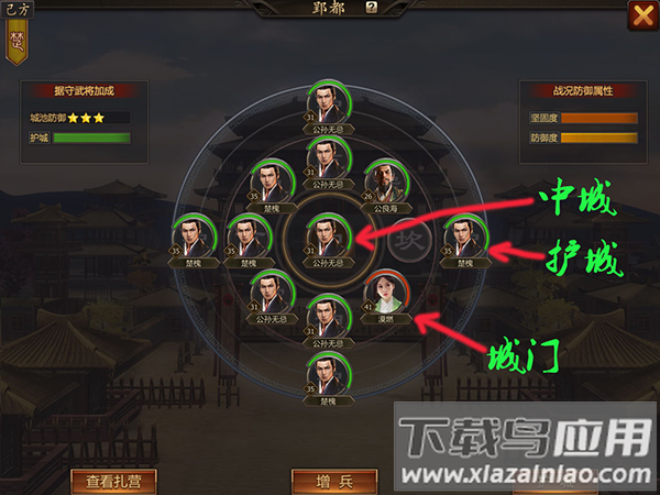 1、在中门布置复活型武将,利用胜利回血特性持久作战;四个护城位要安排控制型将领;