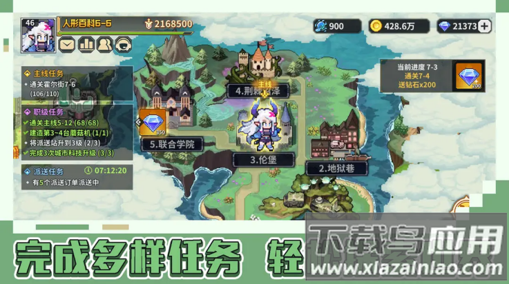 2、建设奇幻都市:修复破损的酒吧商场,让像素世界焕然一新;派遣伙伴收银跑腿,离线挂机也能持续收获资源;