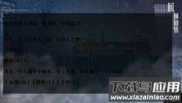 游戏内设52种结局路线,包括流放边疆、位极人臣等不同命运;所有历史对话可在藏书阁回看,关键抉择点会自动生成存档节点;子女培养需分配四书五经学习时间,成年后属性将影响家族势力评分。