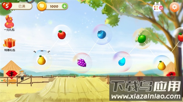 1、采用明快的果园主题风格,水果造型圆润可爱,背景细节丰富,营造轻松愉快的游戏氛围;