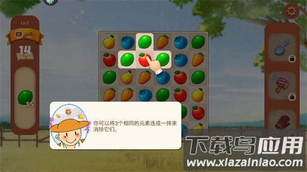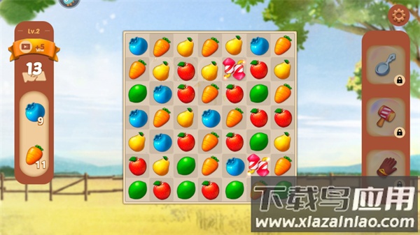 2、关卡目标多样,包含收集指定水果、清除障碍物等玩法,随着进度会解锁特殊道具和挑战模式;