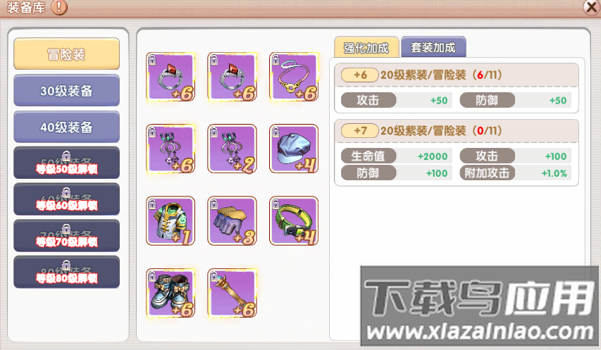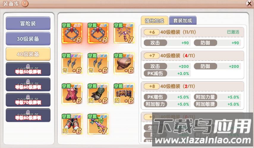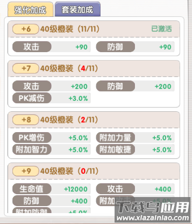 5、强化加成:装备库中的装备会提供额外强化祝福。20级紫装需要强化至+6才能激活祝福;30级后只有橙色传说装备才能提供加成,同样需要+6强化;祝福效果随等级提升而增强:20级装备最高+7,30级+8,40级可达+9。