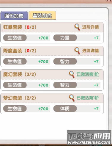 6、套装加成:套装效果分为三个阶段,穿戴两件激活第一阶段,集齐更多件逐步解锁更强属性,每个阶段都有独特加成。