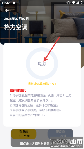 3、进入遥控界面,点击【电源】按钮,按提示对准电器操作。