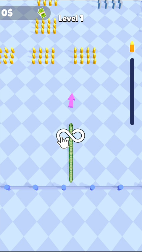 游戏加载完成后,通过左右倾斜设备控制蛇头方向,优先吞噬金色弹药资源;