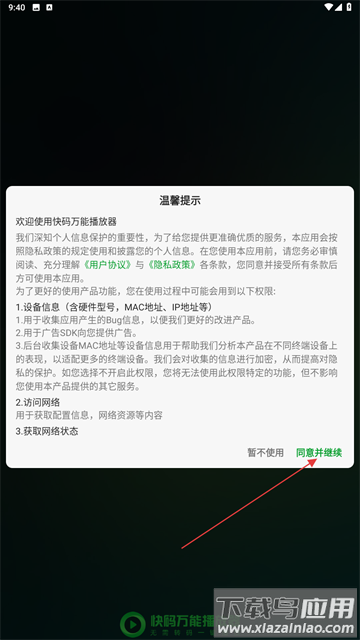 1. 首次使用点击【同意并继续】接受快码万能播放器服务条款。