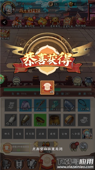 1、主界面点击战鼓图标,每次击打随机掉落装备;