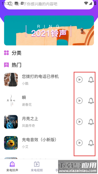 1、在来电铃声页,点击铃声右侧播放按钮试听,或点铃铛图标设为铃声;