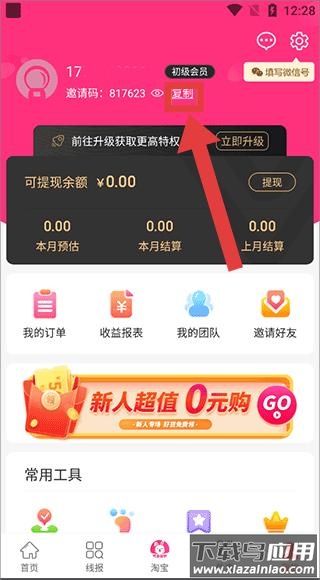 3.个人中心展示专属邀请码817623,点击复制按钮快速分享;升级入口与收益明细并列,功能分区明确。
