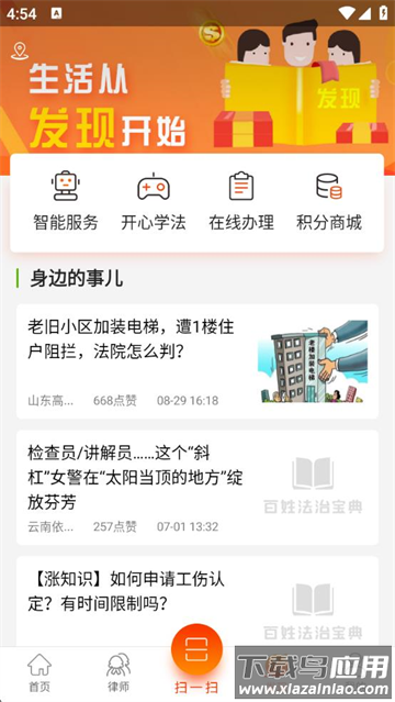 3、发现:定期更新法律知识文章与普法活动资讯;