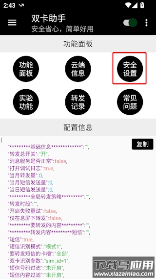 1、打开双卡助手APP,点击安全设置