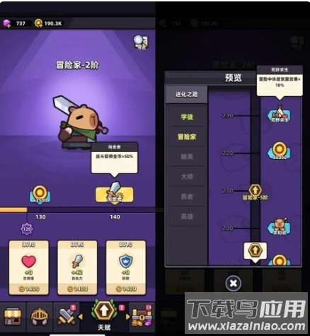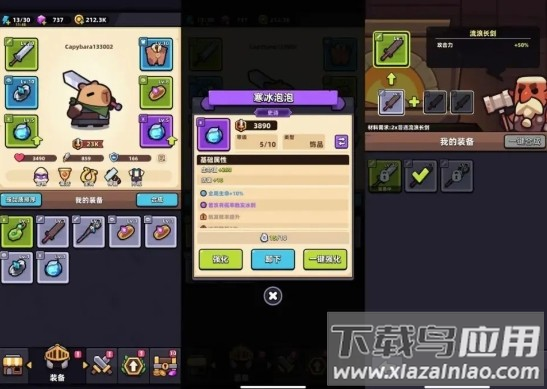 天赋树分为生命、攻击、防御三条路线,升级可激活额外增益。装备通过宝箱获取,支持合成升阶;