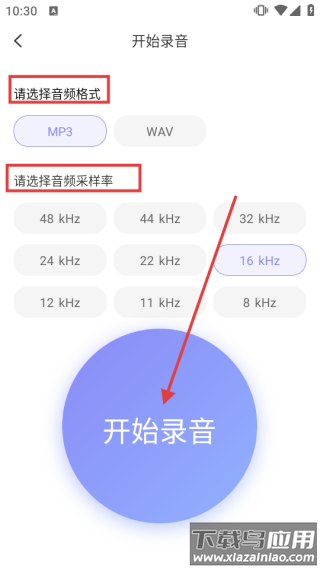 3、在【开始录音】页,选择【音频格式】和【音频采样率】,点击【开始录音】按钮启动录音。
