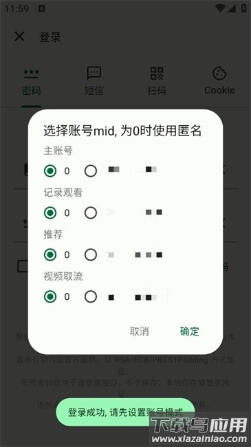 4、登录后选择账号mid点击确定;或是不选择,为0时使用匿名