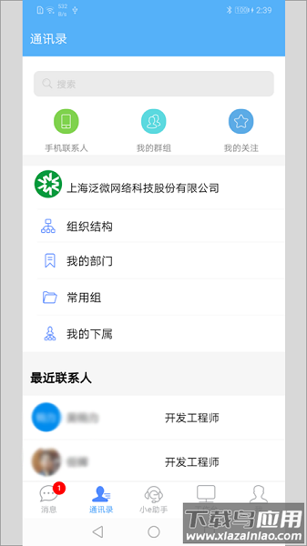 工作台集中展示待办流程、日程会议等核心模块;通讯录支持按部门/职位快速检索同事信息;群组管理允许自定义权限分级,保障敏感数据安全;消息中心聚合审批结果、系统提醒等关键内容。