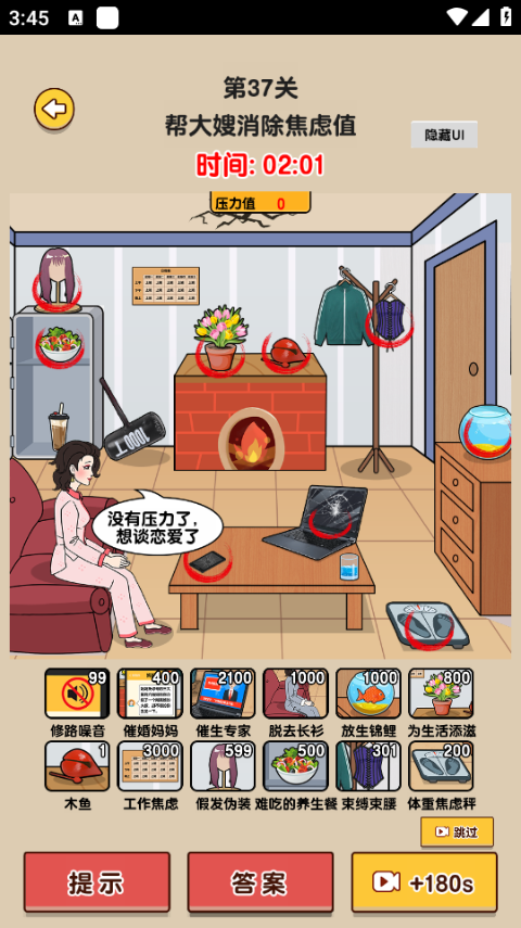 安装后记得点右上角关闭广告,不然会被烦死;第一关要找不育报告、空椅子等11个隐藏细节,注意看墙角脚铐和窗户求救信号;破屋升温关卡要用木板补屋顶,拿火把生火,最后记得用时钟调到白天;让女主开心那关最麻烦,需要先用毒奶酪抓老鼠,再用猫屎泡咖啡,最后给马桶灌凉茶。