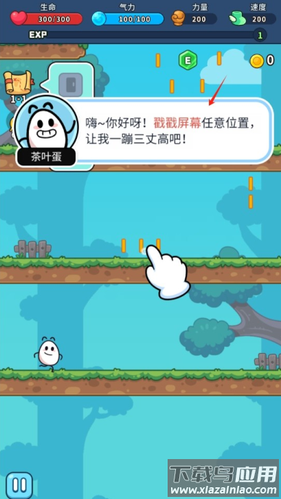 2、通过点击控制茶叶蛋跳跃落点,注意收集金币;游戏采用经典横版闯关模式,金币可用于角色强化;