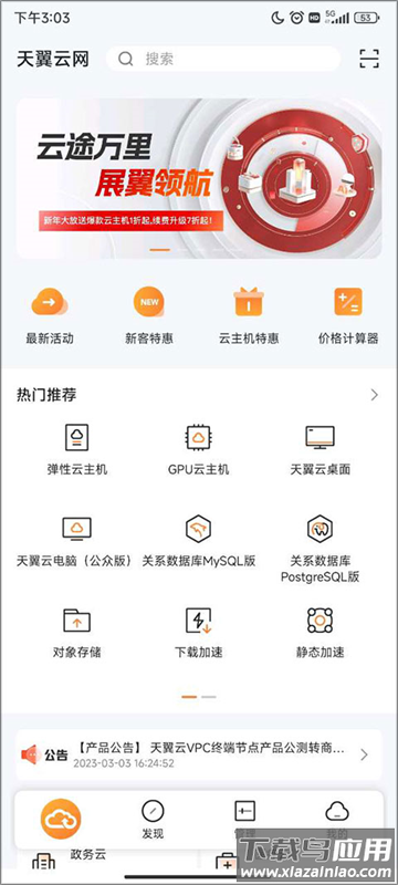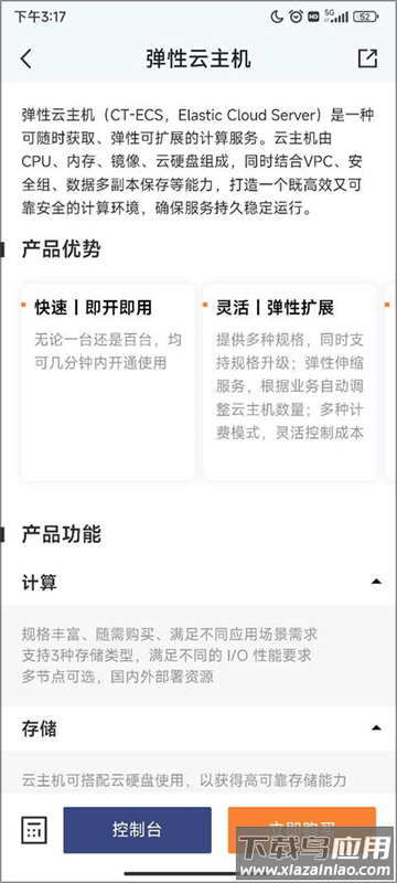 1、安装完成后打开应用,首页展示云主机云存储等核心产品入口;
