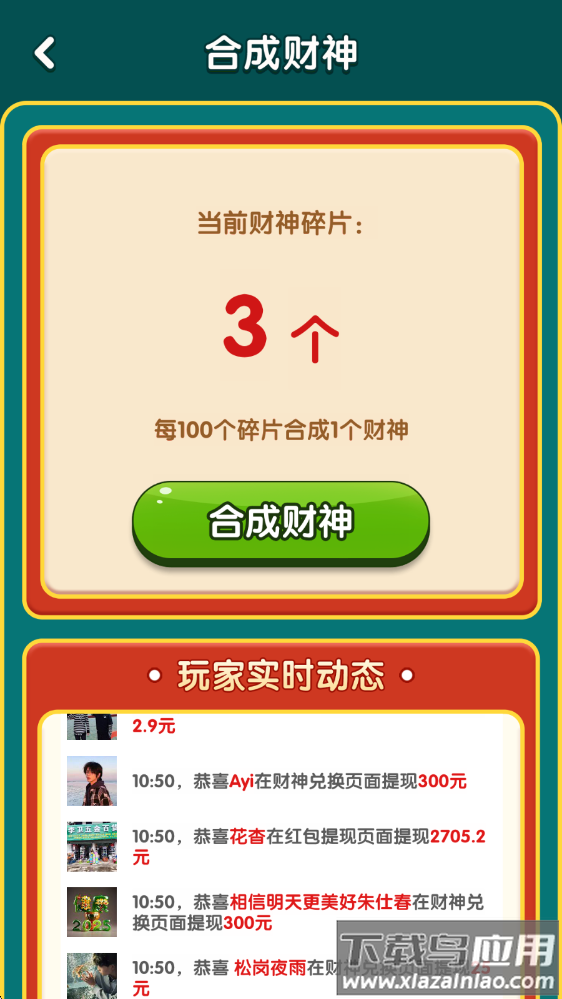 3、游戏内设置财神碎片收集系统,当碎片达到100个时能直接合成完整财神像。