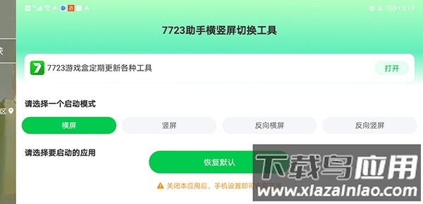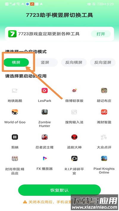 1、下载安装后打开软件,选择【横屏】模式-指定需要横屏运行的应用;