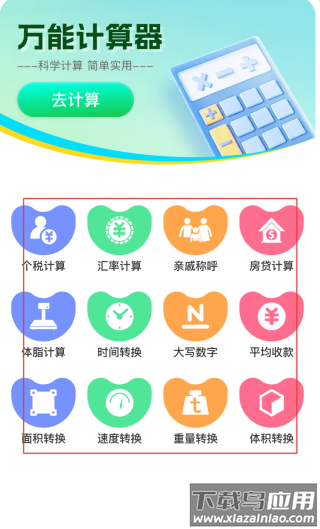 1、万能计算器页,选择【体脂计算】【个税计算】等功能,进入对应计算界面。
