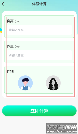 3、体脂计算页,输入身高、体重,选择性别,点击【立即计算】。