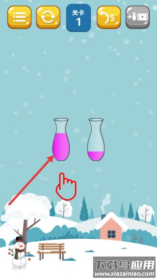 1、首次进入游戏会引导点击左侧紫色烧瓶,液体将按抛物线轨迹落入右侧容器;