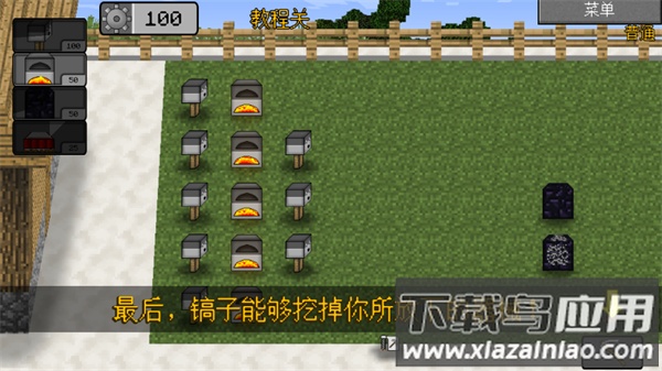游戏提供多种难度递增的章节挑战,每个章节都包含独特的机制和敌人类型;第七章新增的熔炉系统能加速能量获取,黑曜石墙可有效延缓僵尸推进,TNT地雷需要预判敌人路线进行埋设;长按右下角镐子图标可以回收误放的器械。