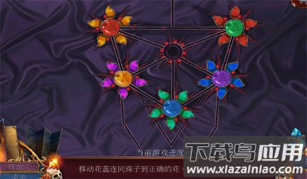 1、移动花蕊到对应颜色的珠子:绿色向上再向右移动,蓝色向下移动,紫色向右移动,黄色向下移动;