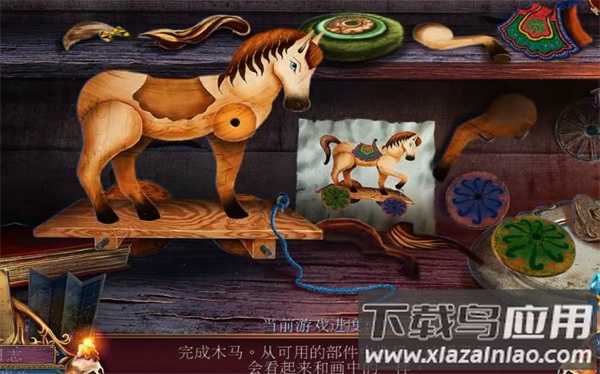 3、拼装木马:参照图纸组装,将四个轮子固定在木板四角,坐垫放置在马背,蓝色绳索系在马颈位置;