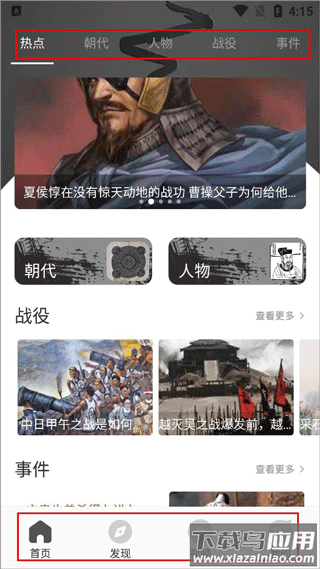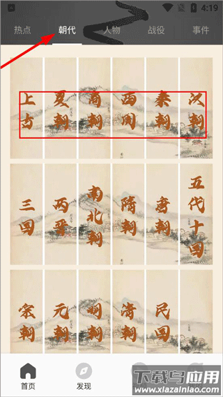 1、打开全世界History app,主要有首页、发现、视频和我的版块,软件上方可以查看热点、朝代、任务、战役等;