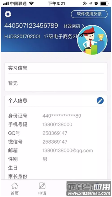 3、使用身份证号登录,初始密码123456,首次登录需核对个人信息;如遇登录问题,需统一提交班级、姓名、身份证号等信息至招生就业指导中心处理;