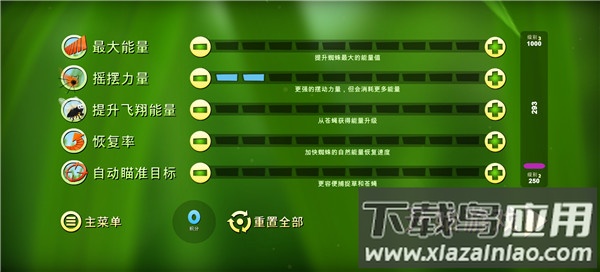 4、想要不被割草机追上给小蜘蛛升级很重要,可以先升级自动瞄准目标和恢复率,摇摆力量和飞翔力量也很重要